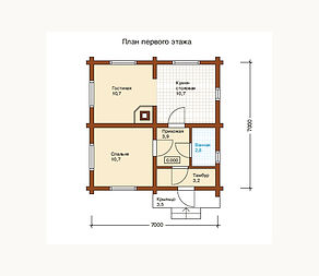 Небольшой загородный домик выполнен из профилированного бруса 100 мм, утепленный пенополистиролом и облицован цементно-стружечными плитами. Дом предназначен для использования под баню. Для этого на первом этаже размещены сауна, душевая, гостиная для комфортного отдыха. Такой домик может быть востребован как загородный для сезонного проживания, и как гостевой. Для этого в пространстве мансардного этажа расположены спальни. Дом прекр асно подходит для строительства на участках малой площади.